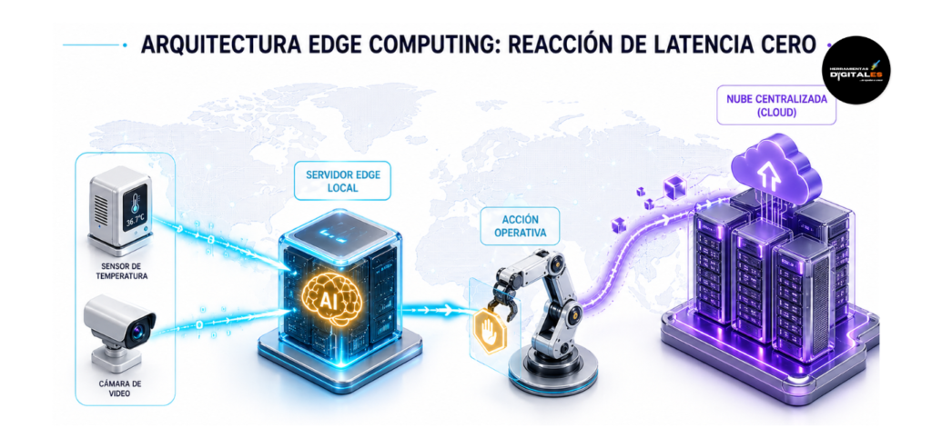 Dato de valor: El Edge Computing es el sistema de reflejos de tu empresa. Mientras que la nube central es el cerebro que planifica y almacena a largo plazo, el Edge es la médula espinal que permite reaccionar a un estímulo doloroso (un error operativo) de forma inmediata, sin «pensarlo» en la nube central. Garantiza la máxima precisión técnica con latencia cero.
